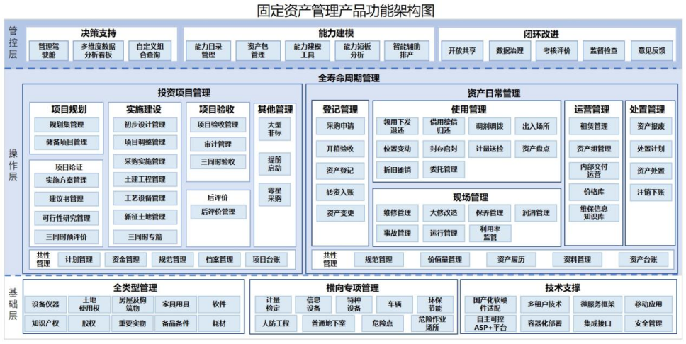 投資經營全過程:從固定資產投資項目規劃、投資決策、項目實施、驗收,到固定資產運營、處置、項目評價全命周期管理。