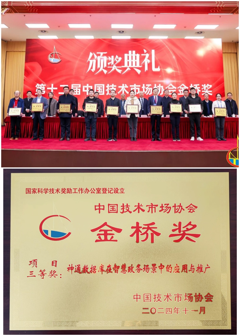 近日,第十二屆中國技術市場協會金橋獎表彰大會在北京召開,神軟子公司神通公司申報的《神通數據庫在智慧政務場景中的應用與推廣》項目榮獲獎項。該獎項于2002年由國家科學技術獎勵工作辦公室批準設立,是全國技術市場行業的最高獎項,每兩年評選一次,旨在獎勵在全國技術市場中做出突出貢獻的先進集體、先進個人和先進項目,以促進科技成果的轉化,推動我國技術市場的繁榮和發展。