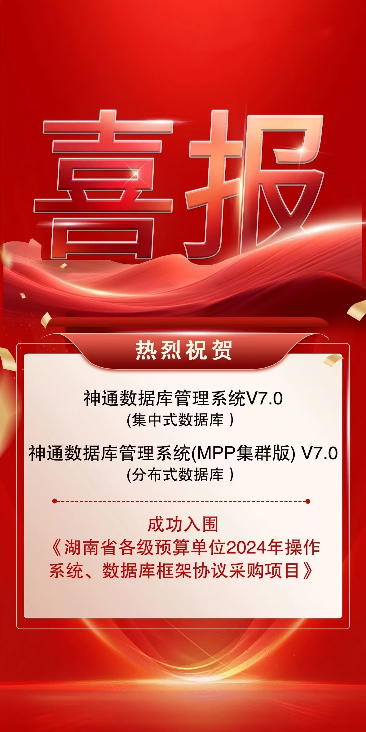 喜訊 神通數據庫入圍湖南省各級預算單位2024年操作系統、數據庫框架協議采購項目
