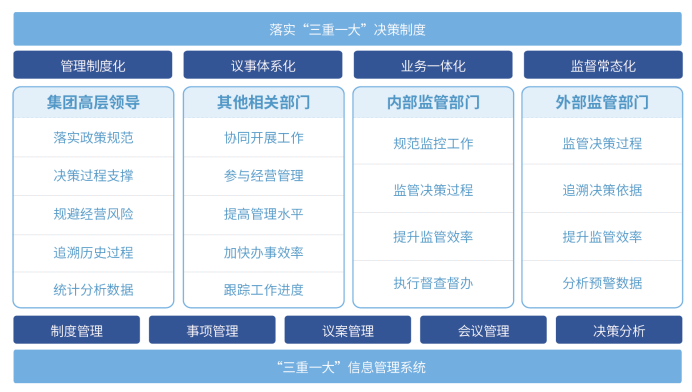 • ??神軟針對企業落實“三重一大”所面臨的挑戰,助力企業構建集團及各級法人單位全級次的“三重一大”決策運行管理系統,通過全景監控、全程跟蹤,全面信息反饋和全部痕跡保留支撐企業切實將“三重一大”落實到實處。針對不同類型用戶提供個性化、定制化的功能和服務,滿足外部監管要求與內部管理要求,從而使公司治理規范化、管理制度化、監督常態化,建立健全“三重一大”科學決策、高效執行、有效監督的工作體制和機制,防范決策風險。